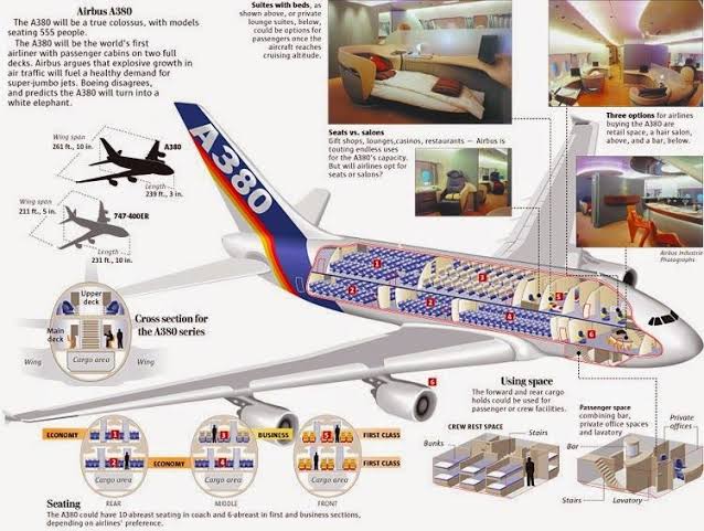 وبحلول عام 2000، توقعت “إيرباص” وجود طلب لألف و200 طائرة ضخمة في العقدين التاليين، وخططت للإستيلاء على نصف هذا السوق، إذ لم يكن للشركة أي حضور في سوق الطائرات الكبيرة في التسعينيات، بحسب ما قاله كبير المهندسين السابق لمشروع “A380” في شركة “إيرباص”، روبرت لافونتان. سلمت شركة “إيرباص” أول طائرة “A380” للخطوط الجوية السنغافورية في عام 2007. وأدى ارتفاع أعداد الركاب إلى الإزدحام في المطارات الكبيرة مثل “جون إف كينيدي” بنيويورك، ومطار “هيثرو” في لندن. ورأت “إيرباص” أن الحل يكمن في طائرة أكبر يمكنها إخراج المزيد من الركاب من تلك المطارات دون زيادة عدد الرحلات الجوية. ولكن، كان هذا الإتجاه يتغير بالفعل، وبدلاً من شراء طائرات أكبر لحمل المزيد من الركاب، اختارت شركات الطيران مساراً مختلفاً وأفضل من الناحية المالية، أي شراء طائرات أصغر واستخدامها لربط المطارات الثانوية، والتي لم تكن مزدحمة. تعني المساحات الداخلية الواسعة في طائرة “إيرباص A380” المزيد من المقاعد في الدرجة السياحية. وكُشف عن طائرة “إيرباص A380” في فرنسا في بداية 2005، وحلقت لأول مرة في 27 أبريل/نيسان من العام ذاته. وعمل لافونتان كطيار اختبار في تلك الفترة. وبعد إجراء عدة اختبارات عليها، وجد لافونتان أنه كان من السهل قيادة الطائرة، فقال: “لم أشعر أنها طائرة كبيرة”. ومع ذلك، شكلت المسافة بين الجناحين عائقاً خلال السرعات العالية، ما أدى إلى زيادة استهلاك الوقود. وبما أن محركات الطائرات شكلت نسبة كبيرة من كلفتها، أدّى وجود 4 منها إلى زيادة سعرها. أضافت شركة طيران الإمارات حانات فاخرة في طائرات “A380”.